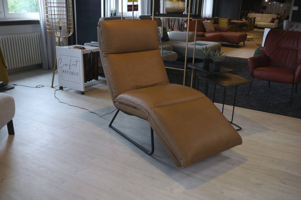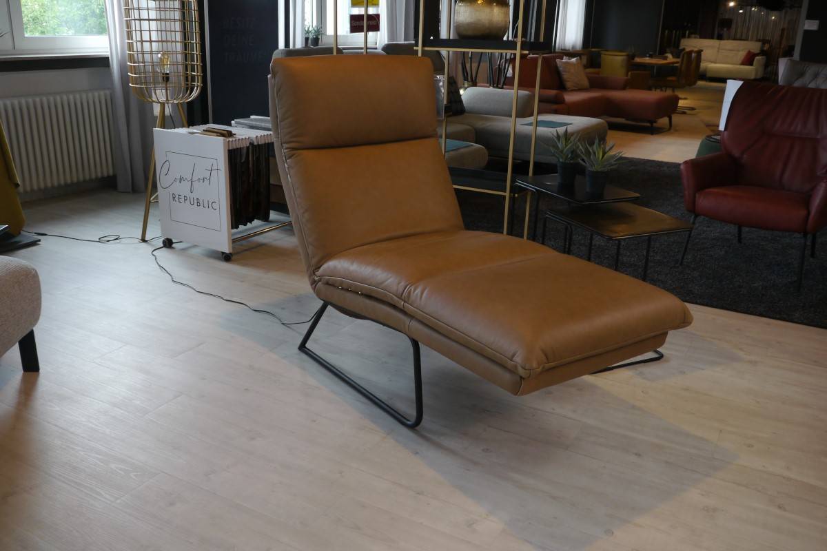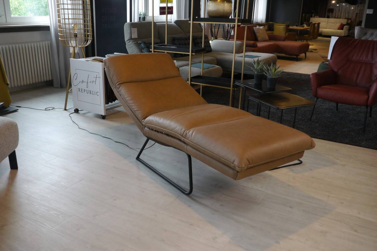 Diese elegante Liege in warmem Cognac-Ton verbindet stilvolles Design mit modernem Komfort. Die klaren Linien und die formschönen Metallkufen verleihen ihr eine zeitlose, hochwertige Optik, die sich harmonisch in unterschiedliche Wohnstile einfügt.